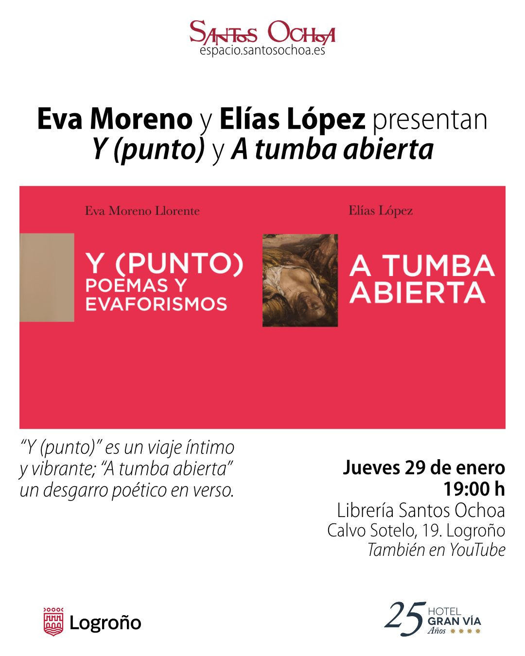 Eva Moreno Llorente y Elías López presentan los poemarios Y (punto) y A tumba abierta.